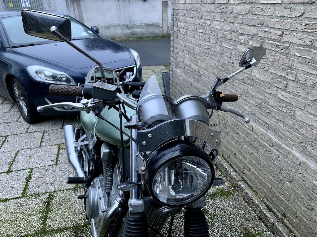 Die Zweite: Lenker, Konis, Wilbers, Stahlflex, LED-Blinker, Faltenbälge, Fender (vorne und hinten) von Triumph Thruxton, Lenkerendspiegel, Heck, Windschild, Klarglaslampe, Tankschutz Bagster, Sattel aufgepolstert