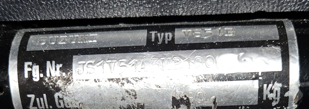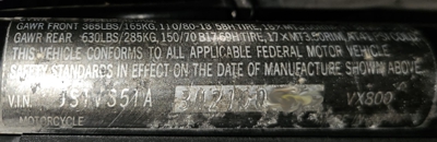 Für die VX800 kommen je nach Land zwei verschiedene Fahrzeugidentifikationsnummern (Vehicle Identification Number VIN), umgangssprachlich auch Fahrgestellnummern zur Anwendung. Die z.B. in Australien und nach unseren Infos nur bei der VS 51A verwendete 17-stellige Langversion (beginnend mit JS1) enthält viele Informationen, die sich dank der Webseite gs-classic.de fast vollständig aufschlüsseln lassen. Demnach bedeutet beispielsweise JS1VS51A3L2100001 Folgendes: