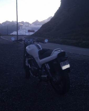 Wurde vom Vorvorbesitzer weiss lackiert, mit schwarzem Rennstreifen, Miniblinker und Lenkerspiegel.