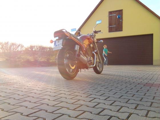 In Originalzustand gekauft. Mittlerweile Stahlflex vorn und hinten, Puig Mini Scheibe, 12V Steckdose unterm Sitz. V2A Kühlerabdeckung, V2A Rahmendreiecke. Umbau/Rückbau auf Einzelklemmen am Lenker für Navilösung