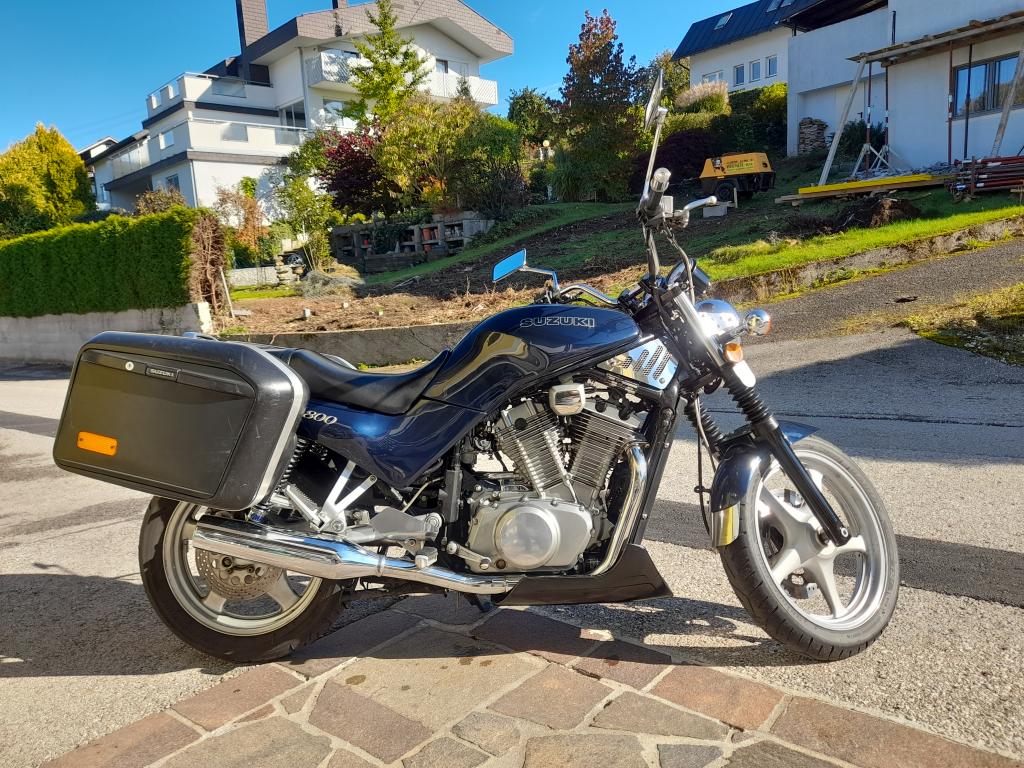 Originale Suzuki Seitenkoffer, Bugspoiler, LSL-03 Lenker mit längerem Gas und Kupplungsseil, Wilbers Ferden vorne und Hagon Dämpfer hinten. Heck ist noch in Arbeit.